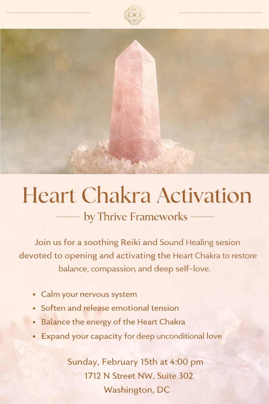 Join us for a Heart Centered Reiki and Sound Healing Experience devoted to restoring balance in the heart and reconnecting with unconditional love.